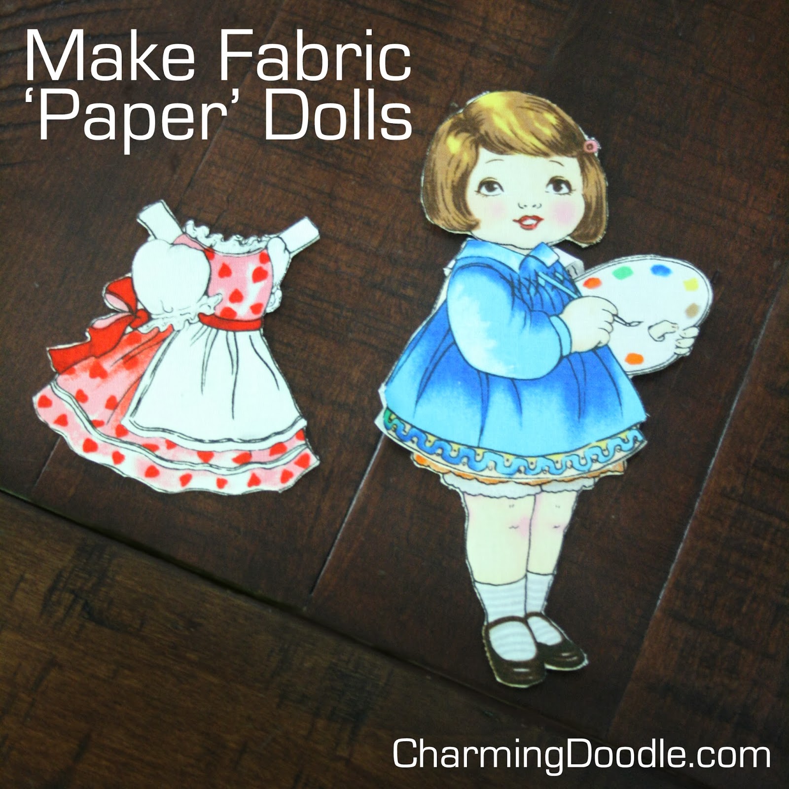 You could do lots of variations of these using the paper doll fabric. Adding Velcro or snaps to the outfits would keep them on securely. You could use fusible fleece and the dolls would stick to a piece of flannel mounted in a frame. Or you could sew these with an additional piece of fabric on the back and stuff them as a soft doll.